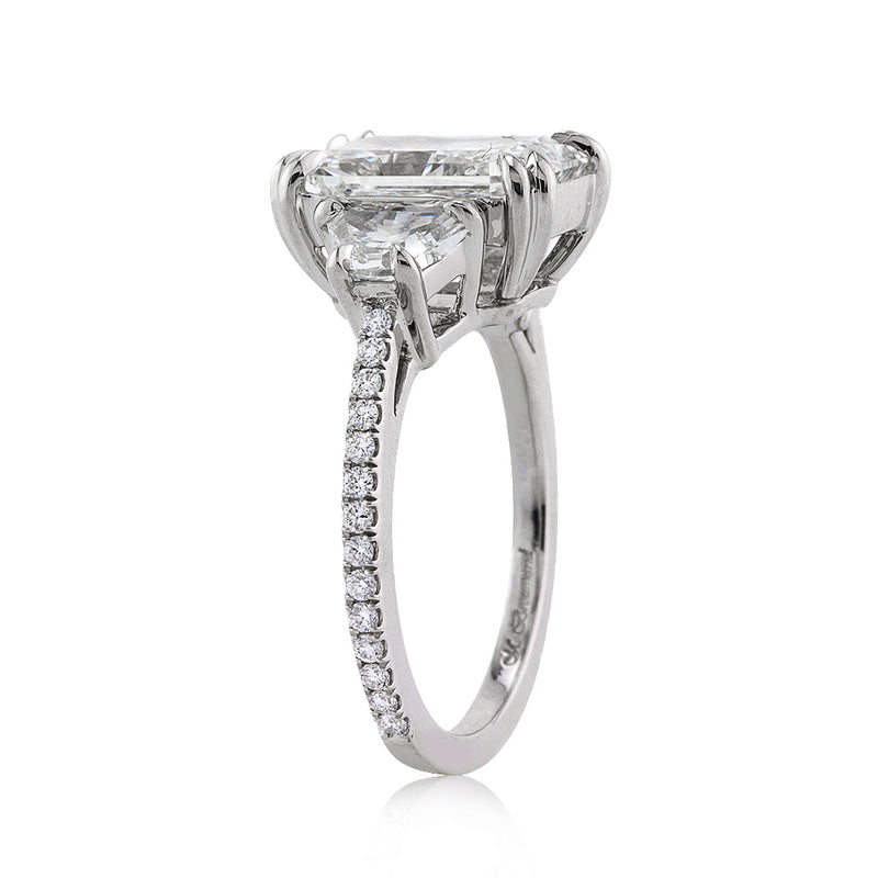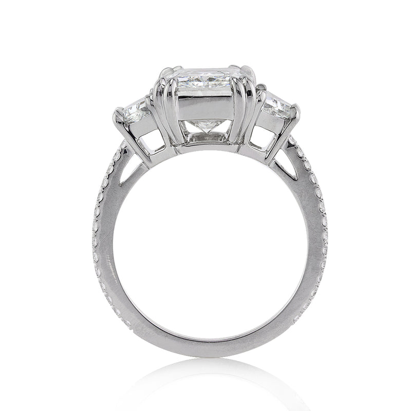 Watch jaws drop and heads turn with this ring on her finger. The incredible custom-made, platinum setting showcases an intensely brilliant 4.04ct radiant cut diamond. The gem is GIA graded at J-VS2, near colorless and eye clean. Double eagle claw prongs grasp the four carat-er elegantly. Two sizable trapezoid cut diamond flank the center diamond for a well balanced look. For a bit of extra sparkle, round brilliant cut diamonds are micro pavé set down the dainty shank about three-quarters of the way. This spectacular radiant cut diamond ring will fascinate and lure admirers for a lifetime.