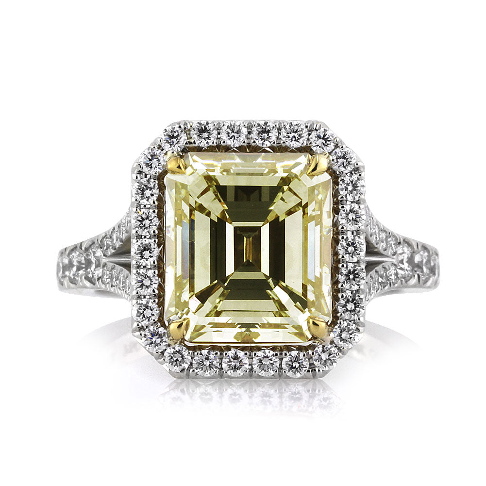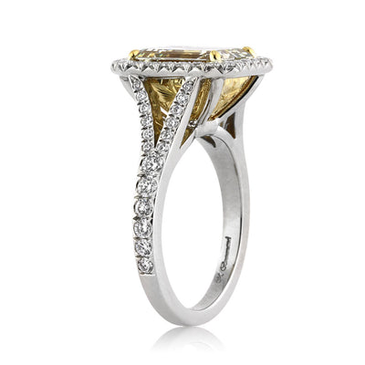 There are no words that can truly describe how exquisite this fancy light yellow emerald cut diamond really is. The incredible 4.05ct emerald cut diamond featured is GIA certified Fancy Light Brown Green Yellow-VS2. The sizable four carat center stone has an amazing color and is absolutely eye clean. The cut is full and quite desirable. The diamond's magnificence is prominently displayed in a masterfully crafted hand engraved 18k yellow gold basket that is encased by a halo of round brilliant cut diamonds. A split shank of micro pave set round diamonds comes down from the micropave halo on this platinum setting. This spectacular fancy yellow emerald cut ring will surely capture compliments for a lifetime.