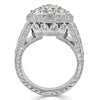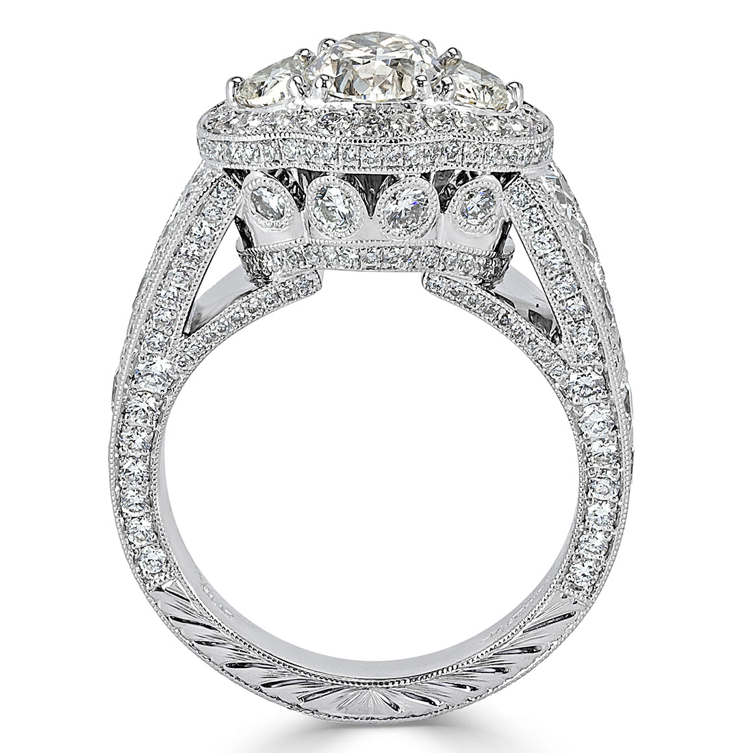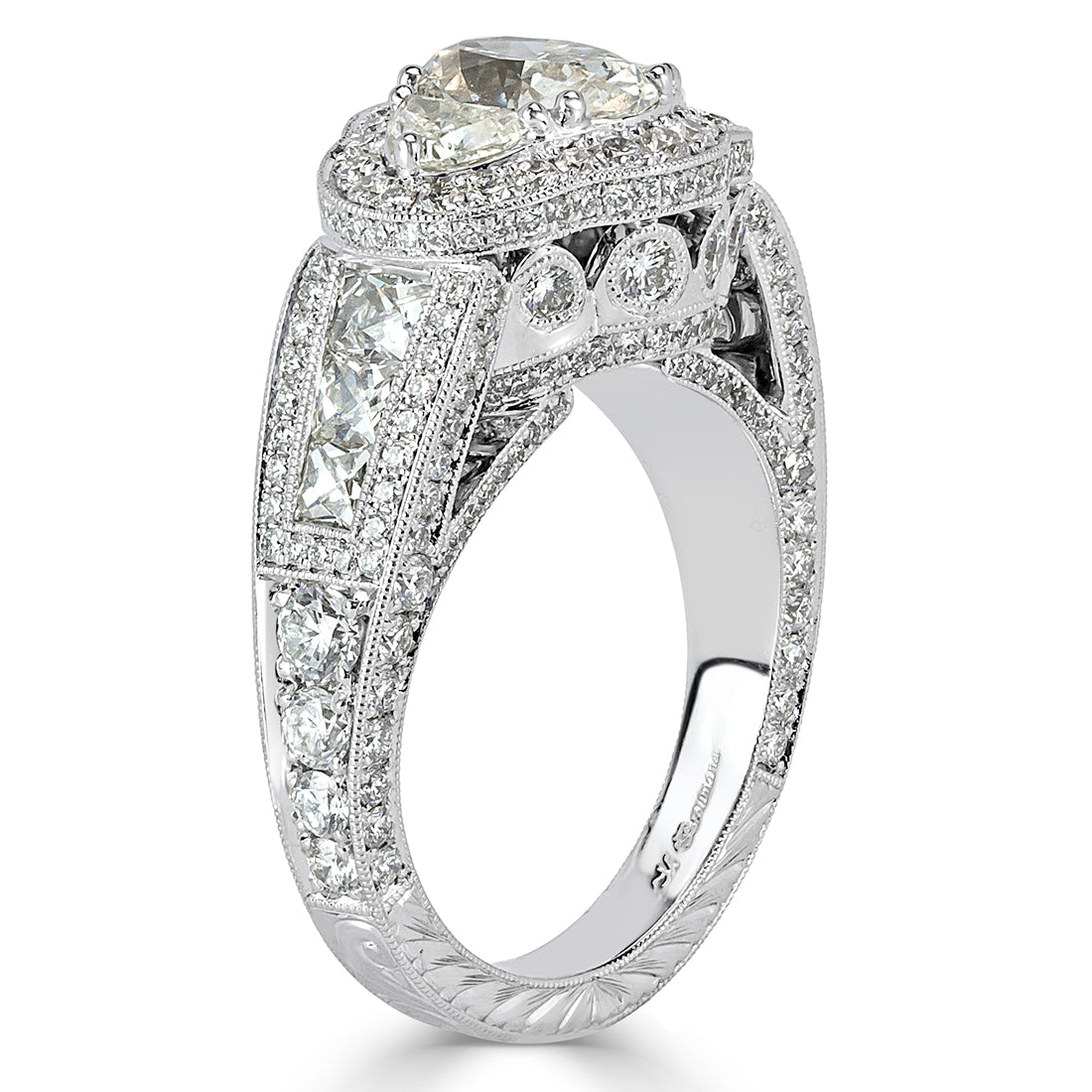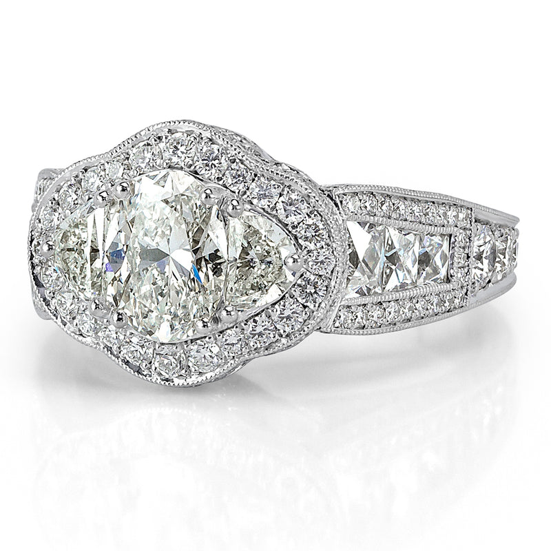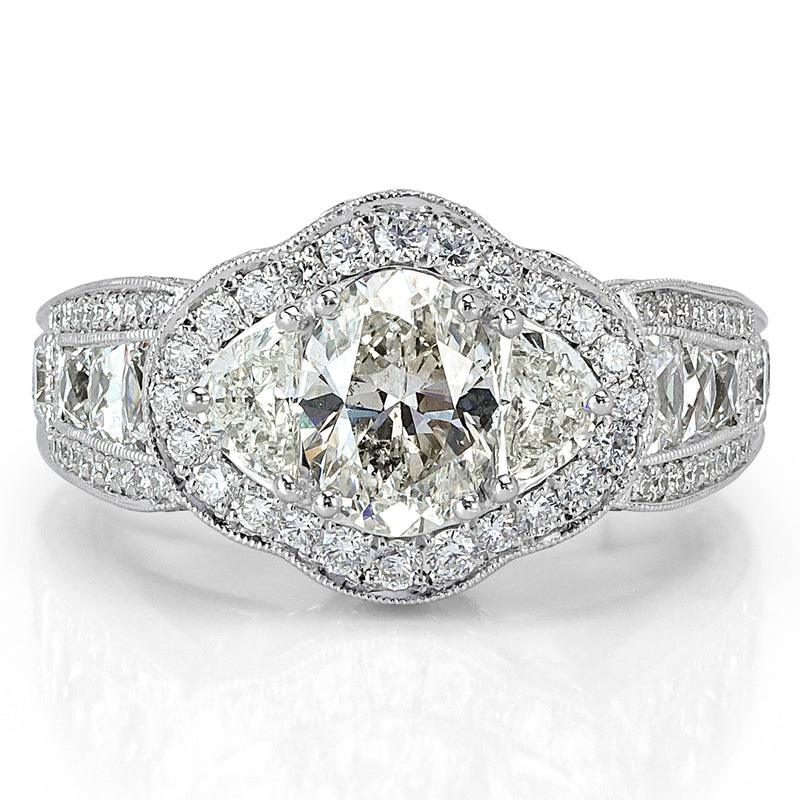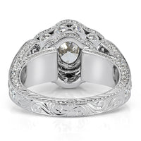 This mesmerizing oval cut diamond ring is truly one of a kind! The beautiful 1.37ct oval cut center diamond is GIA certified at H-I1. The diamond shines beautifully at the center of the three-stone top. The very ornate platinum setting is set with pavé diamonds on all three side and some French cut diamonds at the top of the band. The exquisite vintage style ring is finished with milgrain detail throughout.