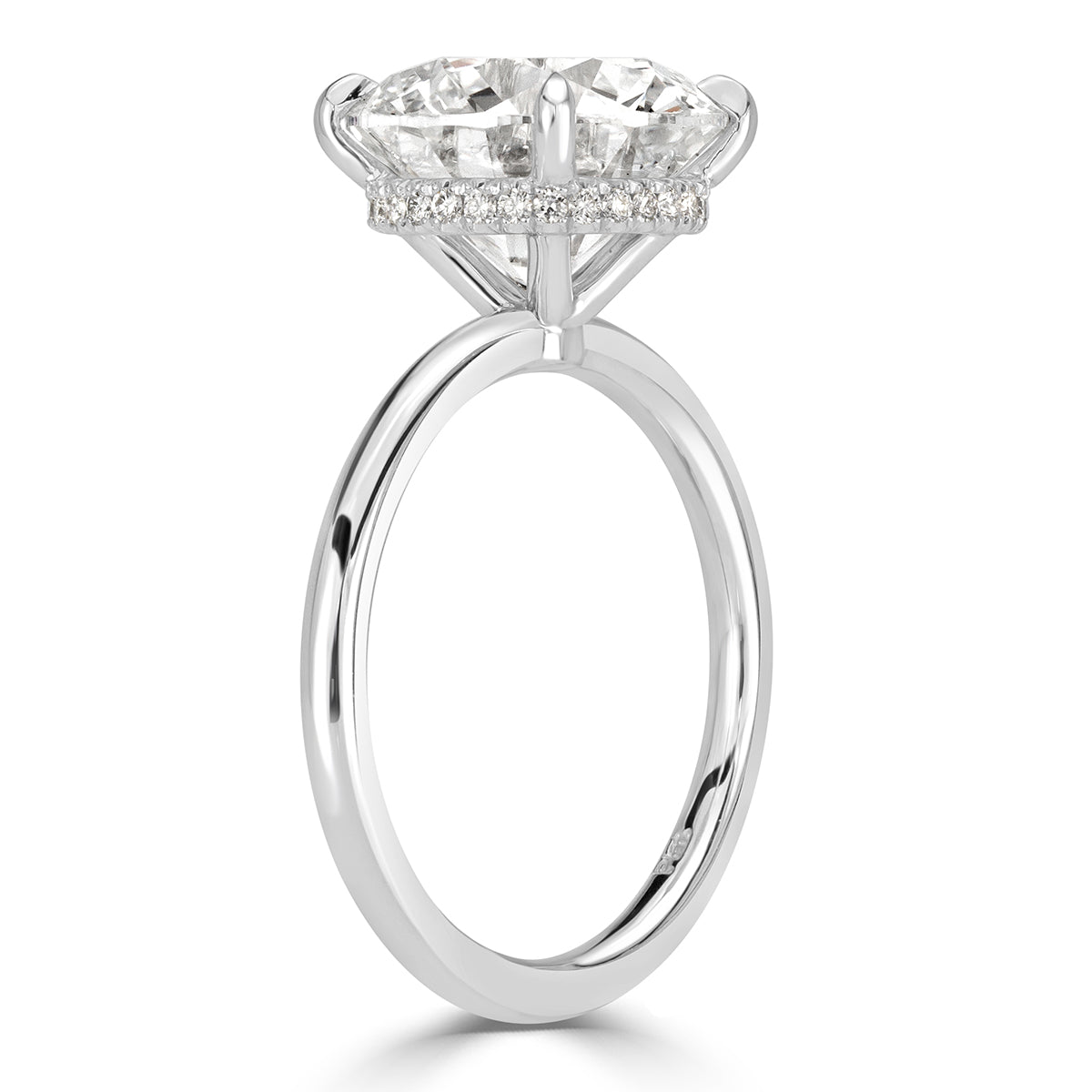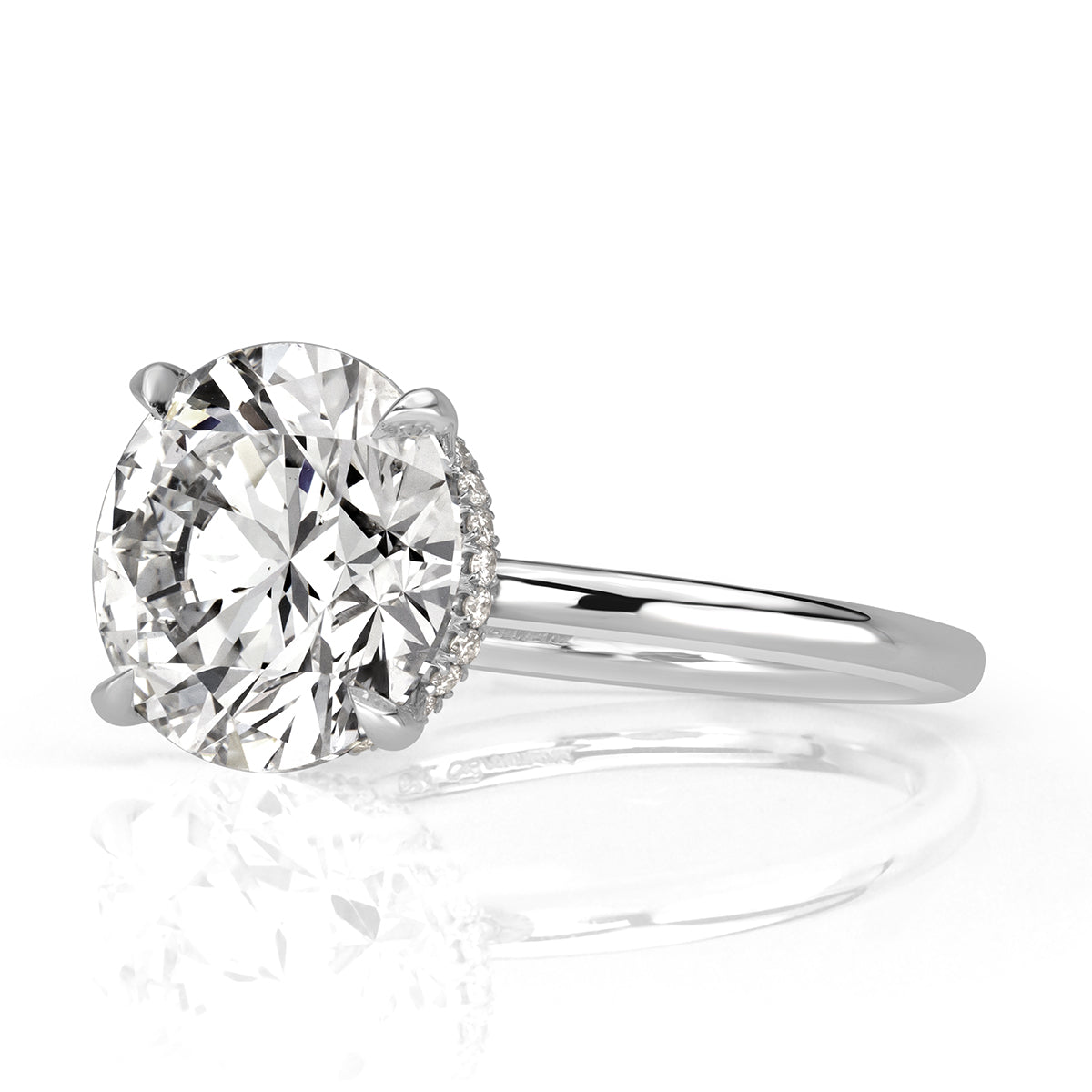 This jaw dropping solitaire engagement ring is glamour at it's finest. This classic design features a mesmerizing 5.05ct round brilliant cut center diamond GIA certified at H-SI1. It faces up a beautifully crisp white and is perfectly eye clean. This beauty is certified at the premium grading of excellence in cut, polish and symmetry. It is perched onto a high polished platinum setting. The simplistic, yet elegant solitaire setting truly allows the center diamond to do all the talking! For additional sparkle, a subtle row of diamonds are handset into the basket of the ring. This piece is absolutely stunning and is sure to be cherished for generations to come.