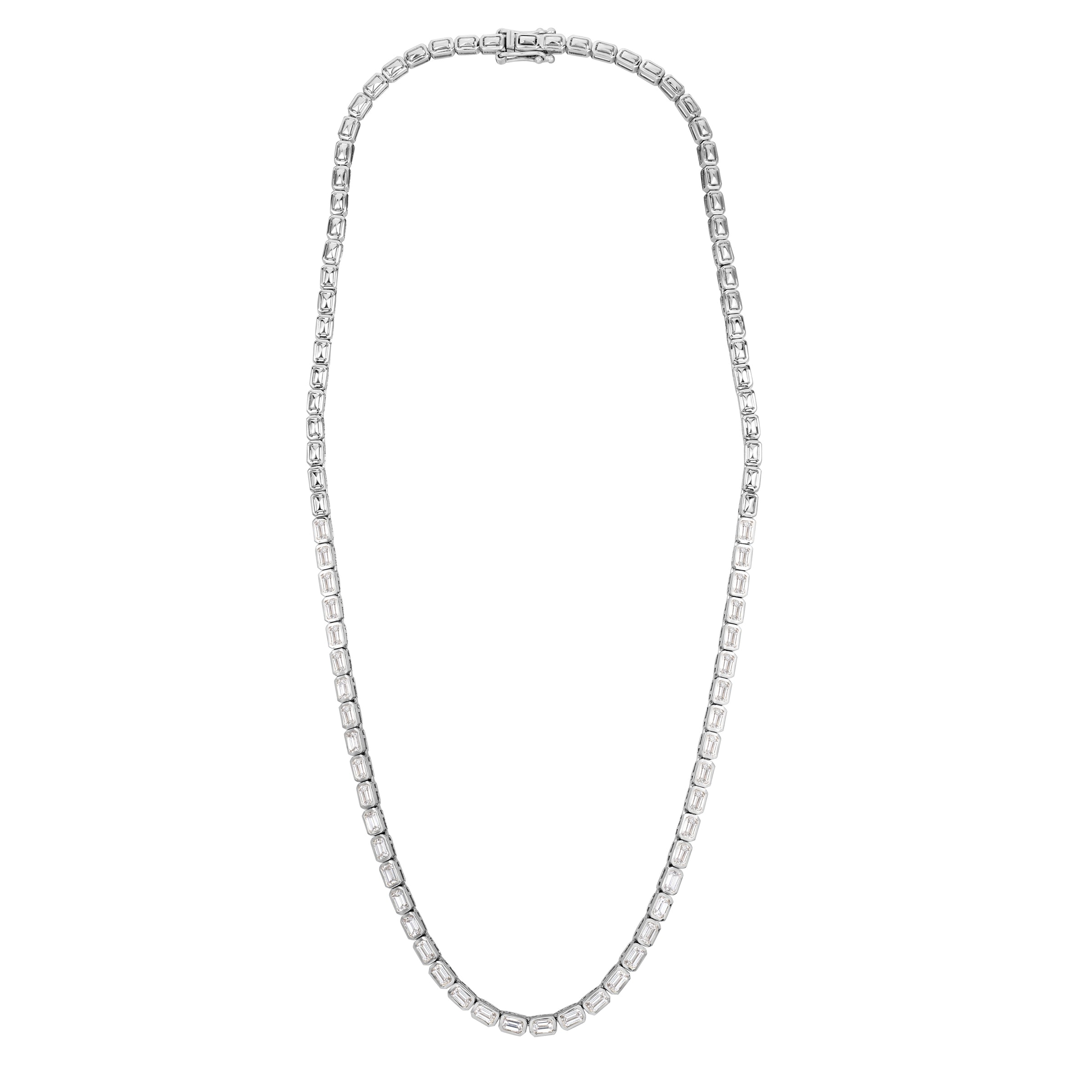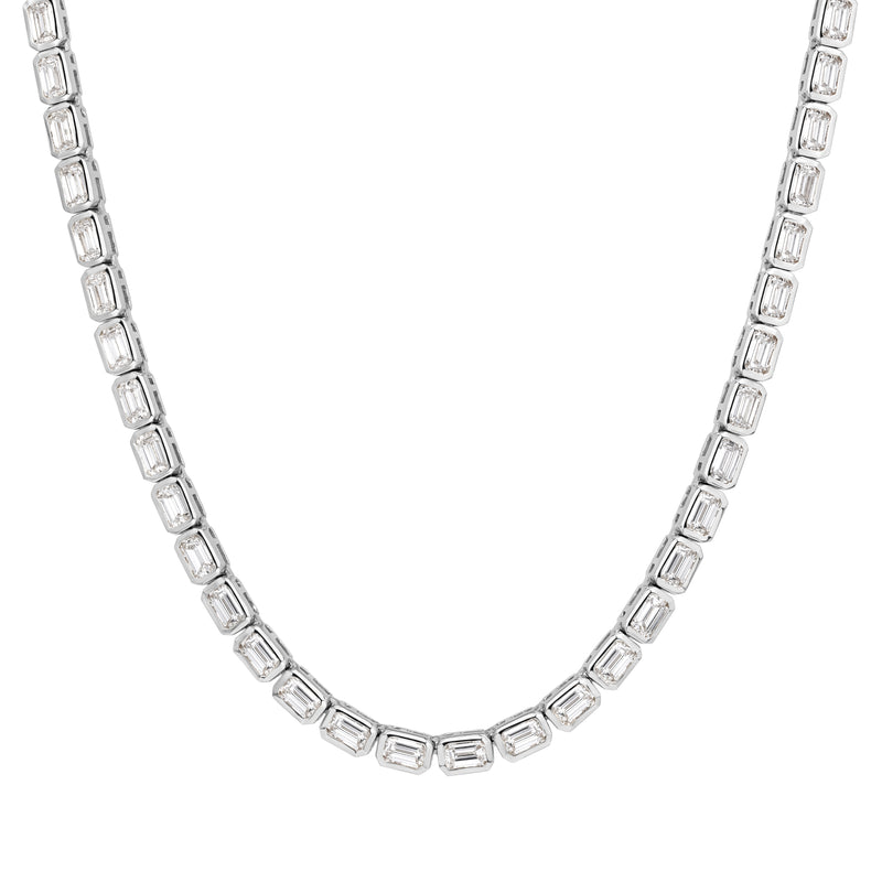 This 5.26ct Emerald Cut Diamond bezel tennis necklace brings together timeless elegance and modern design. Crafted in 14K gold, each diamond is framed in a sleek bezel setting that highlights the clean geometry of the emerald cut while adding durability and a refined finish.