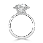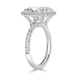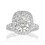 If she is looking for that once in a lifetime ring, then look no further! This beautiful engagement ring showcases an incredible 4.36ct cushion cut center diamond GIA certified at H-IF. It faces up a bright white, is premium in clarity and sparkles with intense scintillation! This beauty is elegantly elongated and measures at 10.07x8.39mm, displaying immense finger coverage. It is also graded at excellence for both polish and symmetry. The centerpiece is surrounded by a halo of shimmering round brilliant cut diamonds. This ring is handcrafted in a luxurious platinum metal and is designed with additional diamonds handset onto the basket connectors as well as down the shank. This gorgeous cushion cut diamond engagement ring has such an incredible value and is sure to win over her heart!