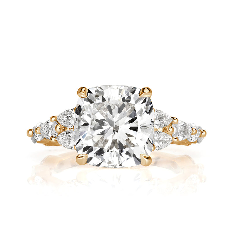 This remarkable cushion cut diamond engagement ring leaves nothing to the imagination with its unique and beautiful design. The stunning 4.20ct cushion cut diamond showcased in the center is GIA certified at I-VS1. It faces up a brilliant white and is an incredibly clean stone. The side diamond design is stunning and compliments the cushion cut elegantly -- a trio of pear shape diamonds gracefully sit above marquise cut diamonds on either side of the 18k champagne yellow gold setting. For additional sparkle, our signature hidden halo design dazzles from beneath the center diamond. Intricate design, large size, and true quality---this cushion cut diamond engagement ring has it all!