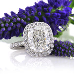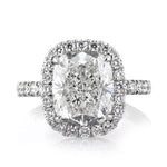 Everything about this breathtaking, one-of-a kind cushion cut diamond engagement ring is spectacular! The impressive 4.36ct cushion cut center diamond is GIA certified at H-IF. It is white, flawless in clarity and immensely brilliant! The cut, polish and symmetry are all graded at excellent! The handmade platinum setting showcases it perfectly featuring a halo of round diamonds and a row of round diamonds set down the sides in a micro pavé setting. The center connectors are embellished with round diamonds as well. This substantial diamond engagement ring is sure to be treasured for generations to come.