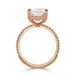 Designed with presence in mind, this stunning radiant cut diamond engagement ring sparkles from every angle. This piece features a dazzling 5.01ct radiant cut center diamond GIA certified at J-VS2. Beautifully white, perfectly eyeclean and extreme sparkle defines this beauty! The finger coverage of this radiant is jawdropping with it's amazing measurements of 11.09 x 8.72 mm. It is also graded at excellent for both polish and symmetry. Handcrafted in a soft 18k rose gold setting, this design showcases a lovely hidden halo basket detail as well as shimmering diamonds going down the shank in a delicate micropavé style. This radiant cut is exceptionally proportioned to display maximum finger coverage and will compliment any finger!