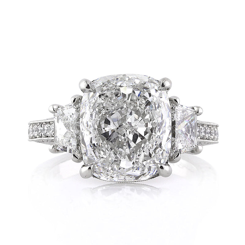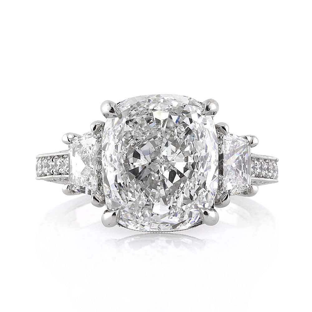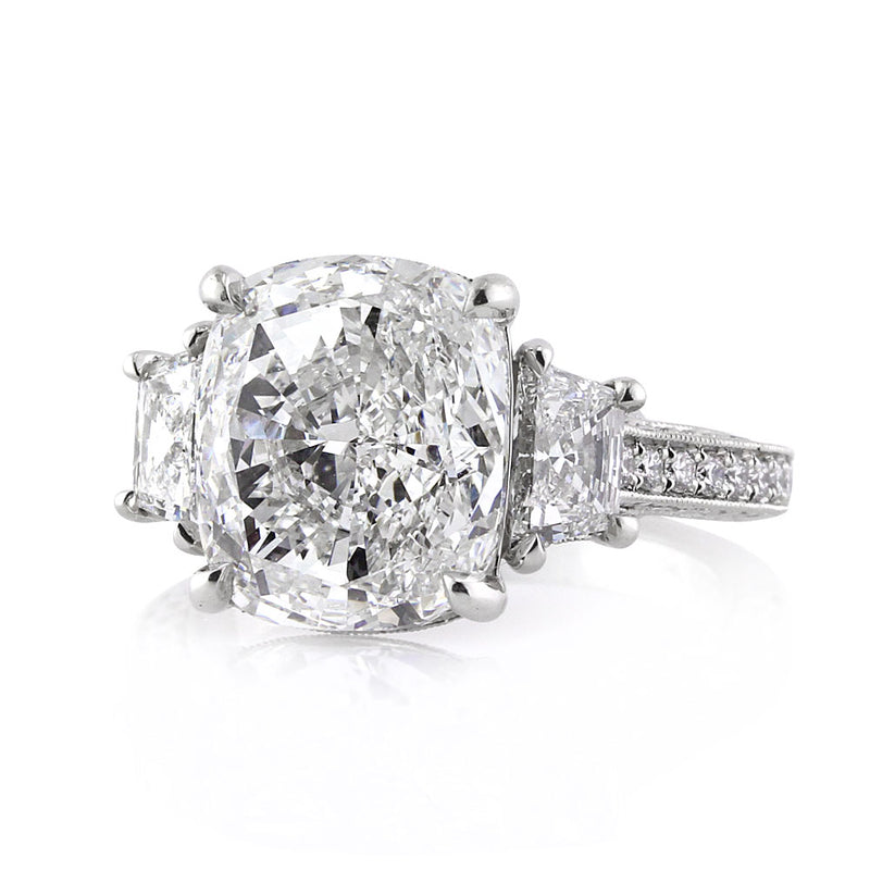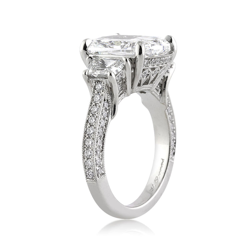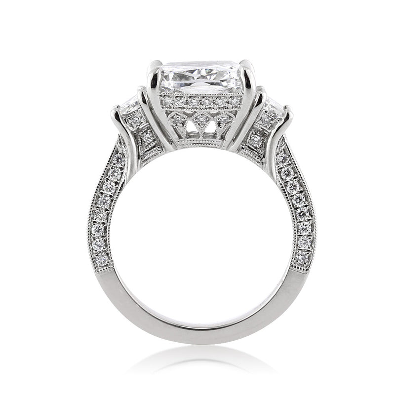 From every angle, this cushion cut diamond engagement ring has phenomenal sparkle and fabulous design. Featured in the center is a jaw droppingly beautiful 4.00ct cushion cut diamond GIA certified at E-SI1, colorless and eye clean. The massive four carat center stone is flanked by two well matched trapezoids set in a custom pavé setting. The front and back of this platinum diamond ring are embellished with hand laid milgrain and pavé round brilliant cut diamonds for extra sparkle and design detail. This incredible cushion cut diamond ring will be cherished for many generations.