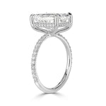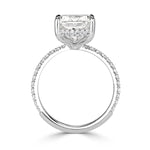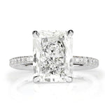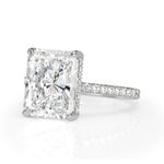 This phenomenal radiant cut diamond engagement ring is the ultimate statement piece. This design showcases a gorgeous 5.07ct radiant cut center diamond that is GIA certified at F-VS2. This deluxe combination is an incredible value with the diamond facing up colorless and perfectly eyeclean! This beauty measures at a jawdropping proportion of 11.20 x 8.75 mm and displays more like a 5.50ct+ diamond. It is also graded at excellent for both polish and symmetry and displays crisp, clean facet patterning. Perched on top of our signature hidden halo design, the centerpiece truly speaks for itself. Additional diamonds are set going down the shank of the ring in a delicate and shimmery micropavé style. This radiant cut diamond engagement ring is an absolute dream come true and will sparkle from miles away.
