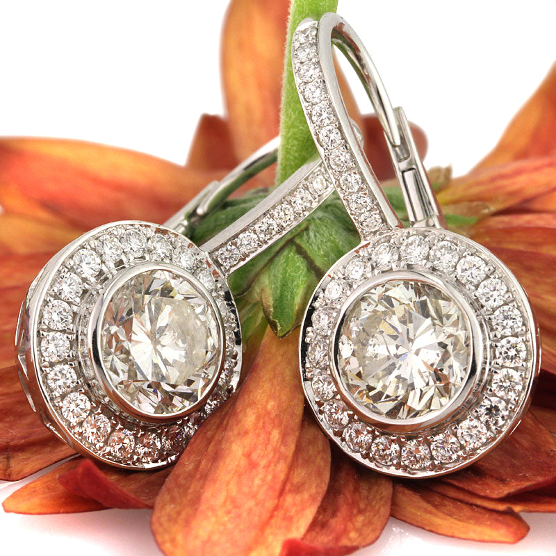 This gorgeous pair of round brilliant cut diamond earrings are custom crafted to perfection! They feature two round center diamonds totaling almost four and a half carats. They are bezel set in the center and accented with a row of round brilliant cut diamonds around them. The hoops are pave set with a row of round diamonds. The locks are very strong and safe as well. Mesmerizing in so many ways!