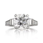 This remarkably beautiful, rare and extremely brilliant antique European round cut diamond ring will leave you speechless! This gorgeous 3.50ct antique round cut diamond is EGL certified, one of the leaders in diamond grading, at H-VS2. It is perfectly white and very clear! The cut is outstanding and it sparkles tremendously. It has a combination of size, quality and cut that is very hard to find in these antique cut diamonds. It is accented by two large step cut trapezoid diamonds. The shank is pave set on all three sides with round diamonds. The center basket also features two large carre cut diamonds on the front and the back. It is just awe inspiring! You will love it. Get ready for the wows!