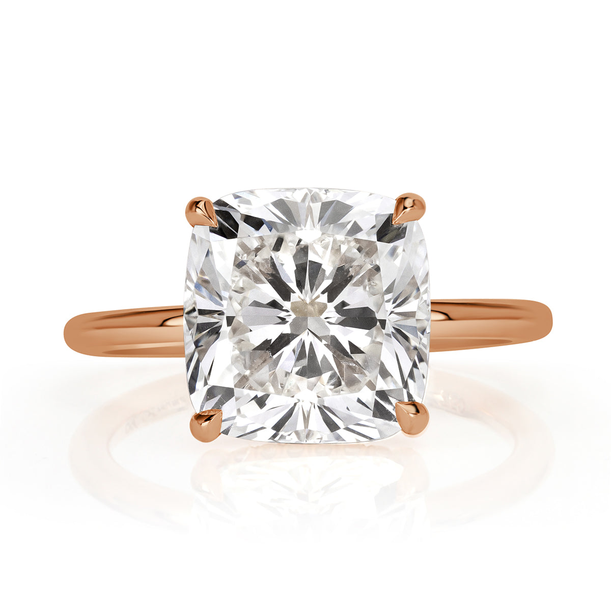 This bold cushion cut diamond engagement ring is sure to be her dream ring! The 18k rose gold setting features an incredible 5.50ct cushion cut diamond GIA certified at J-VS1 and graded at excellent in both polish and symmetry. The pillowy diamond has a crisp white color and amazing clarity. It measures at an stunning 10.28x9.95mm and gives off amazing finger coverage. The breathtaking center diamond is set on a delicate solitaire setting with an added hidden halo of round brilliant cut diamonds. This mesmerizing cushion cut diamond engagement ring is sure to capture her heart!