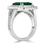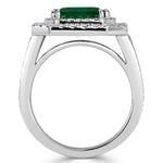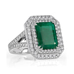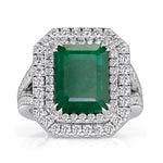 This emerald and diamond ring is absolute magnificence! The centerpiece features a mesmerizing 4.47ct GIA certified emerald cut emerald handset in a sharp eagle clawed double prong and double halo platinum setting. The refined deep-green of the emerald center is enhanced by the sparkling accents of round brilliant cut side diamonds that are certified at top color grades of E-F, VS1-VS2 quality. This stunning work of art encompasses all fine details including the milgrain touches on the split shank of this setting. This regal ring is meant to be worn by the elegant and sophisticated woman.