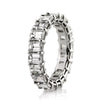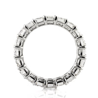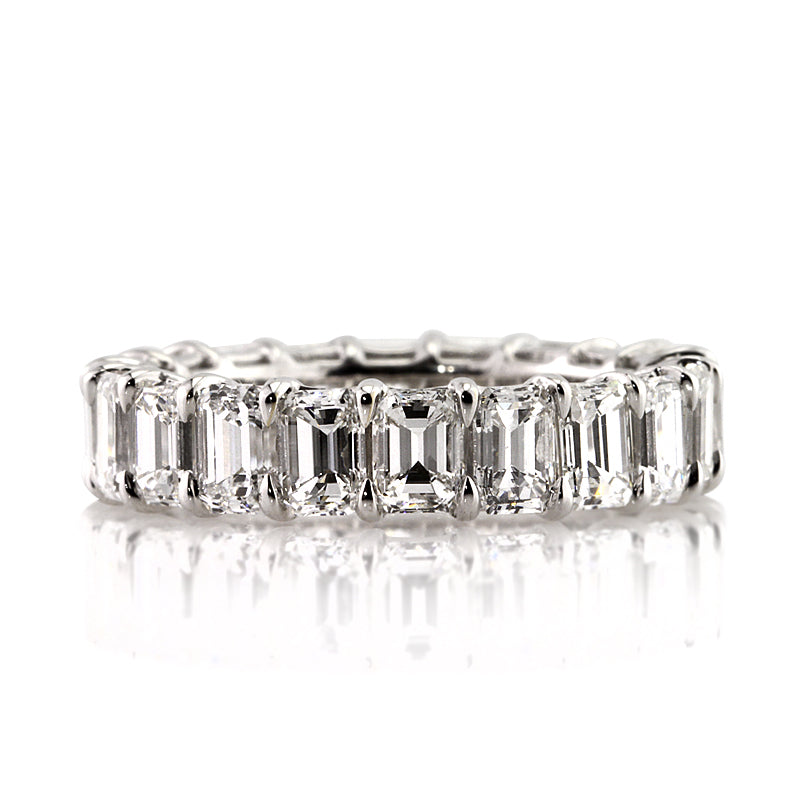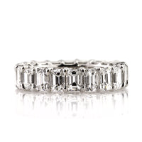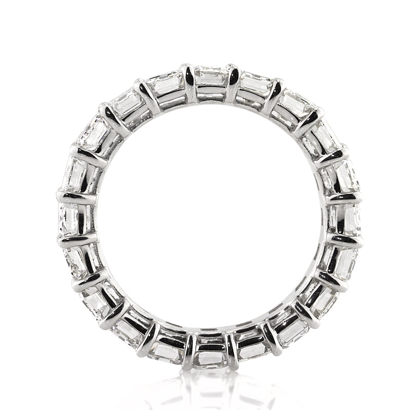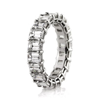 This sensationally beautiful emerald cut diamond eternity band has such an astonishing look and sparkles beautifully! It is set with 6.20ct of perfectly matched emerald cut diamonds. Each and every diamond is hand selected for its exceptional cut, color and clarity combination. The diamonds are all E-F in color and VS1-VS2 in clarity. They are exceptionally white and perfectly clear! Each ring is handmade to perfection in a shared prong 18K white gold setting that showcases each diamond beautifully with very little metal showing. It sits on the finger very comfortably as well. Amazing in so many ways!