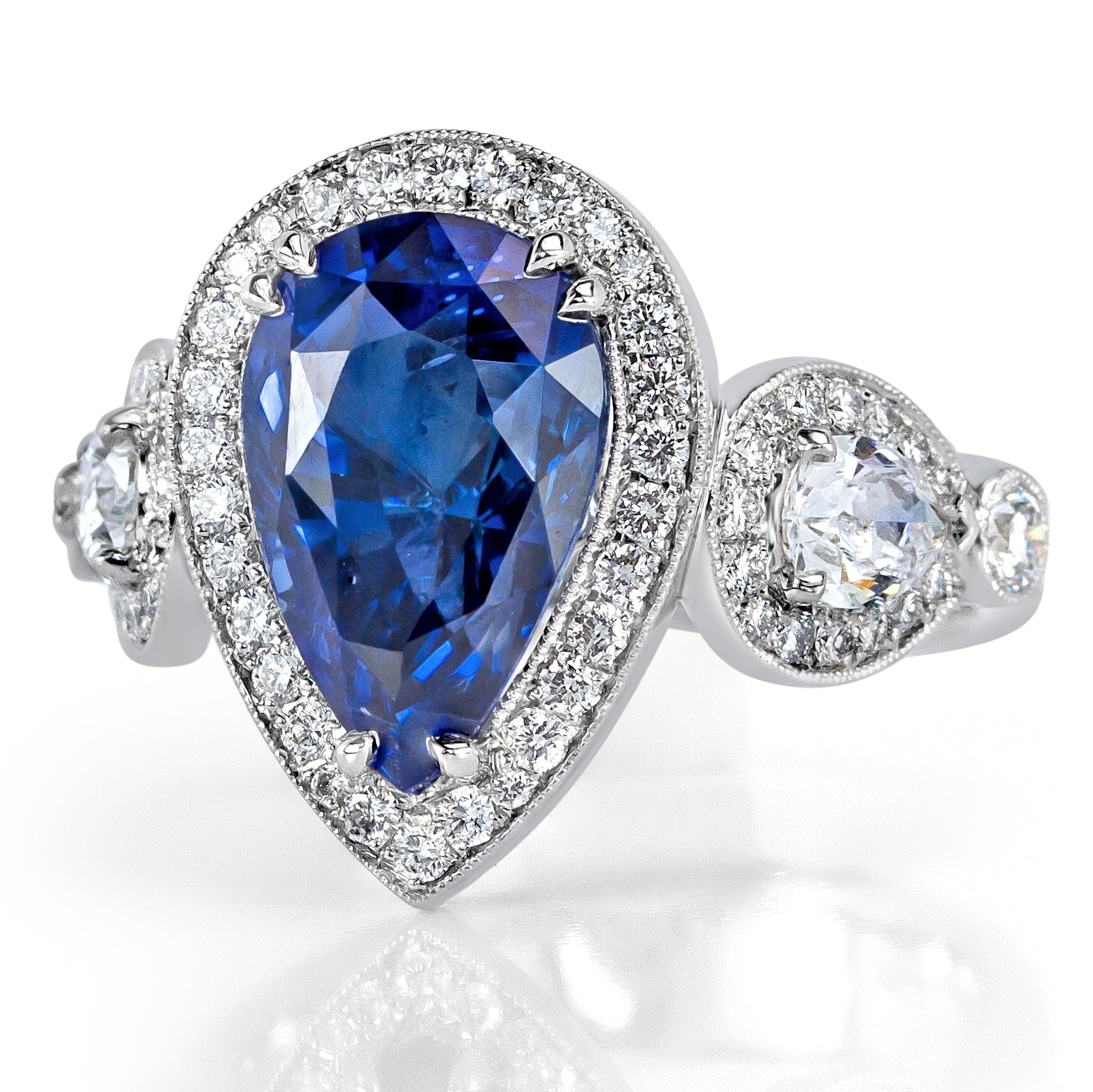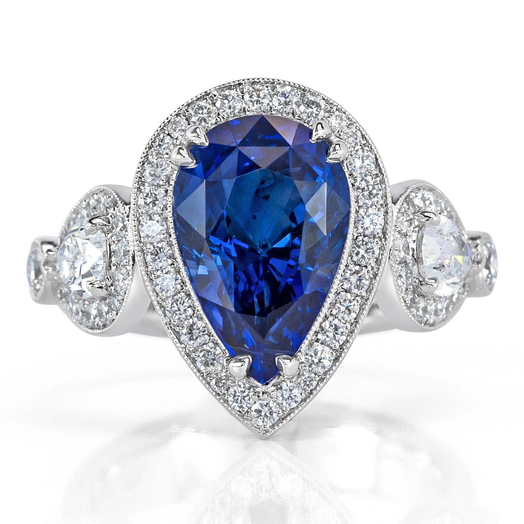 This color-popping pear shaped sapphire and diamond engagement ring possesses excellent craftsmanship and phenomenal size! The large center sapphire is a 5.40ct pear shaped diamond that is GIA certified no heat. The bright color is a lovely, eye pleasing rich blue. It is set in a halo of round, bright, white diamonds in a pavé setting. The side of the platinum ring is set with two pear shaped diamonds also surrounded by halos. This stunning sapphire engagement ring makes a huge statement on the hand and will draw attention in any room.