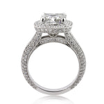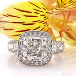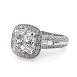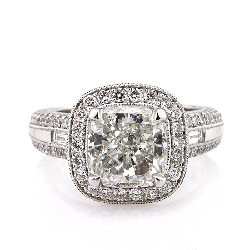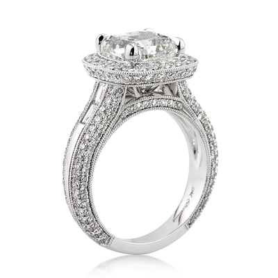 This remarkably beautiful, one of a kind cushion cut diamond engagement ring is sure to leave you speechless! This custom-made platinum ring showcases an astonishing 4.03ct cushion cut diamond in the center. It is AGS certified (one of the leaders in diamond grading) at G-SI2, white and extremely brilliant! This inclusions are white and blend into the diamond giving you that eye clean look. The magnificent diamond is surrounded by a halo of round diamonds in a pave setting. The sides of the halo are also studded with round diamonds. The shank features two baguette cut diamonds channel set in the center with round diamonds set in a micropave setting going three-quarters of the way down the shank. It is so extremely beautiful! A very unique design for a very unique cushion cut diamond! A magnificent piece you will cherish forever!