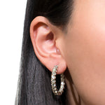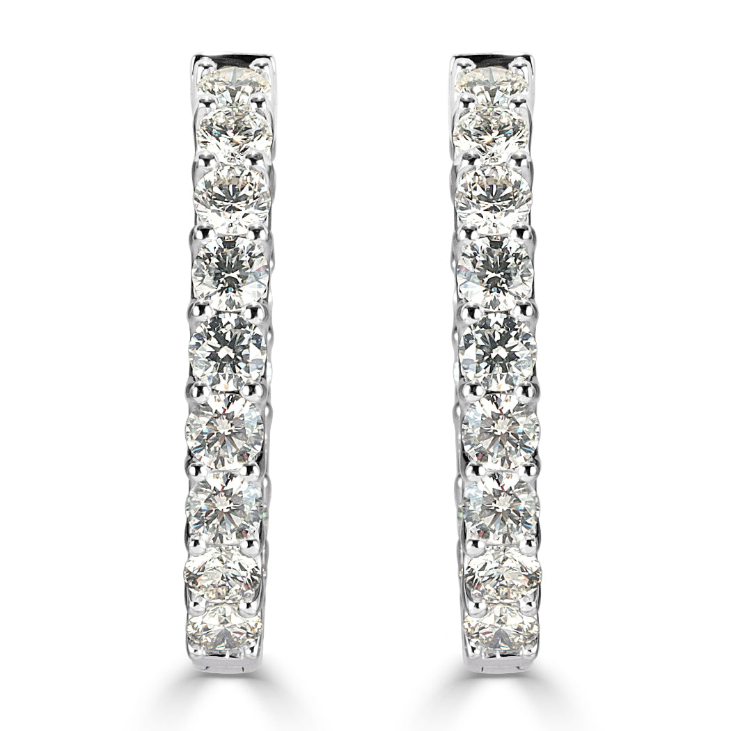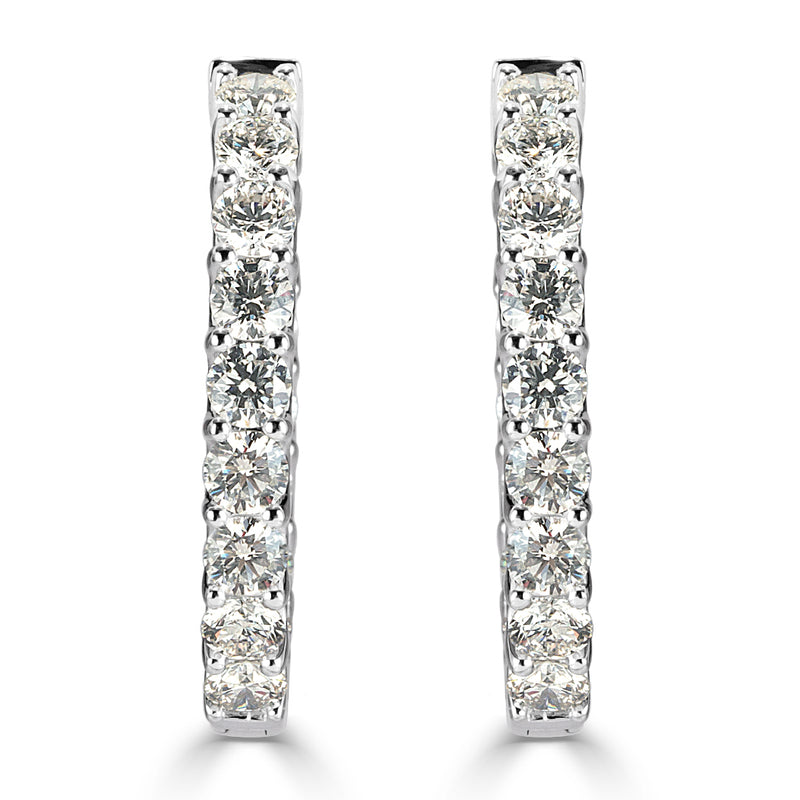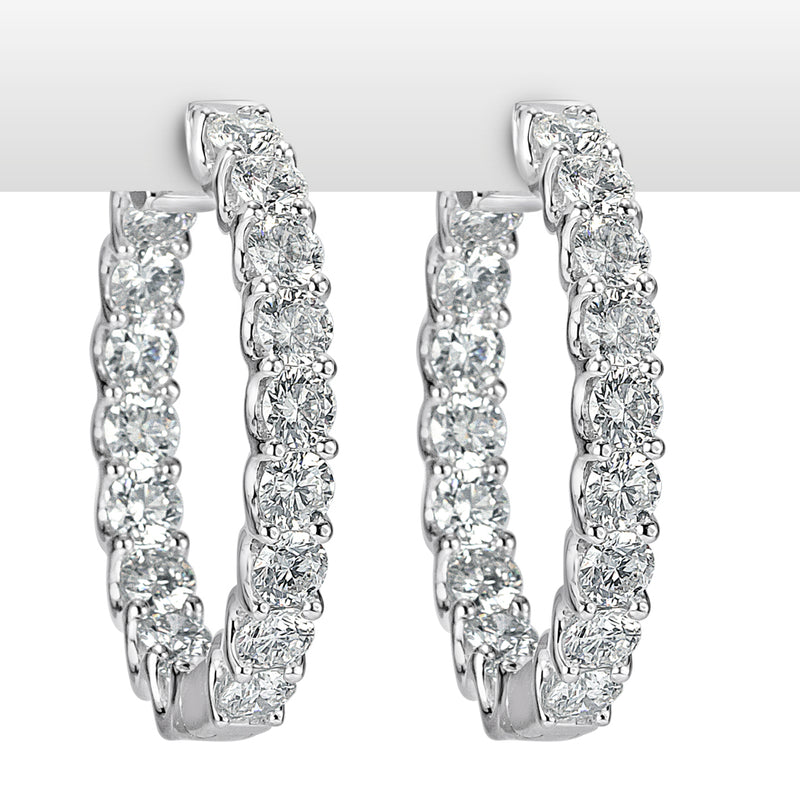 There is a whopping seven carats of round brilliant cut diamonds on these hoop earrings. The look is dramatic and unforgettable. The colorless, clear diamonds are set on 14k white gold with a secure push lever.