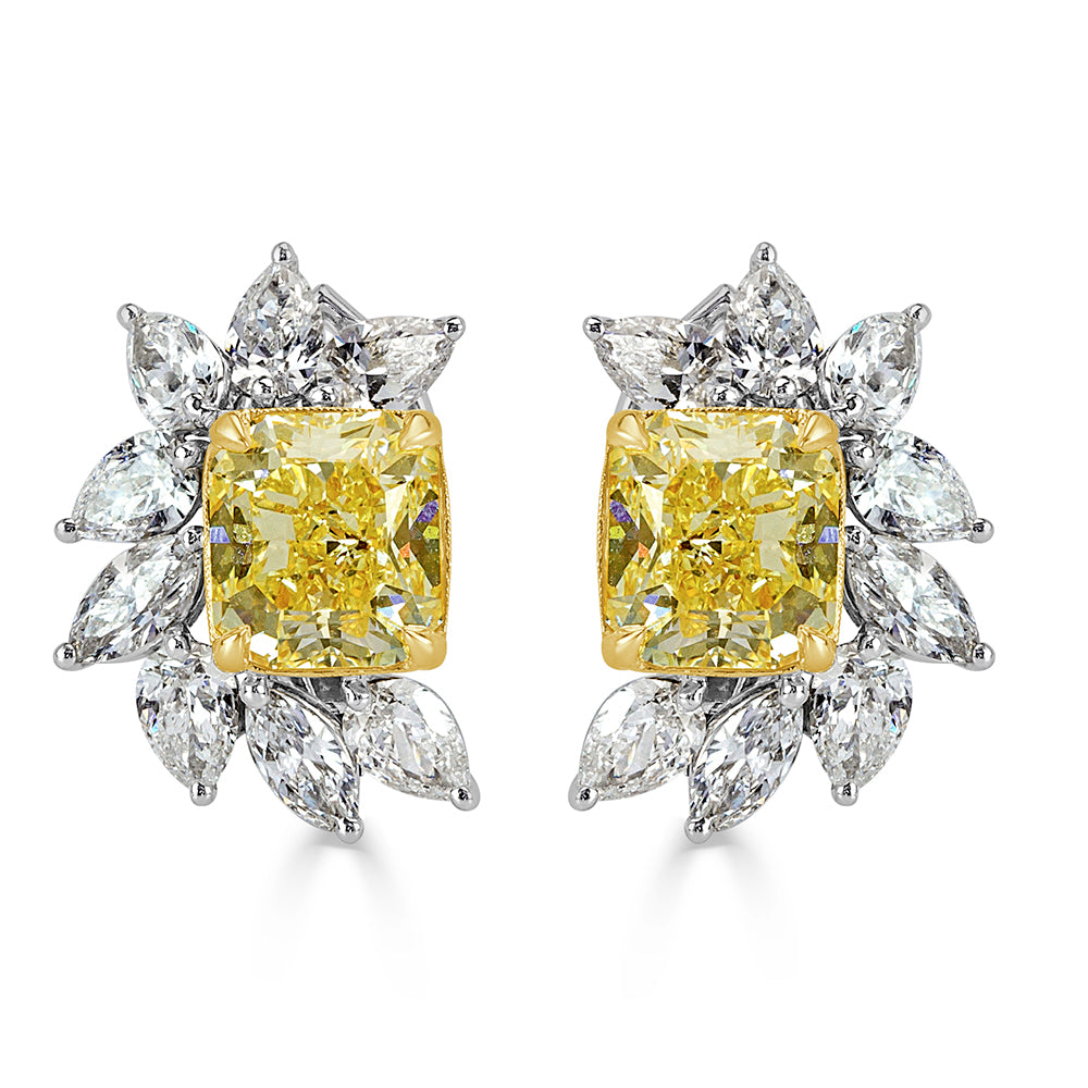 8.82ct Fancy Yellow Radiant and Colorless Marquise Cut Diamond Cluster Stud Earrings