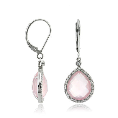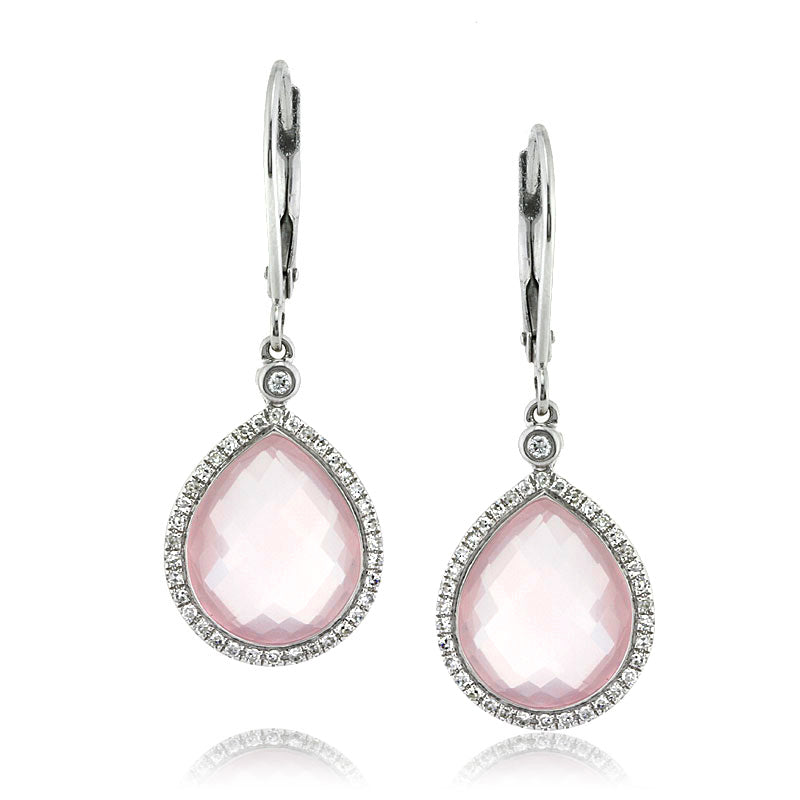 These pretty pink earrings have a nice pop of color. The center rose cut pear shaped rose quartz are encased in a halo of bright white round diamonds set in 14k white gold. The sparkly earrings are beautiful and classic.