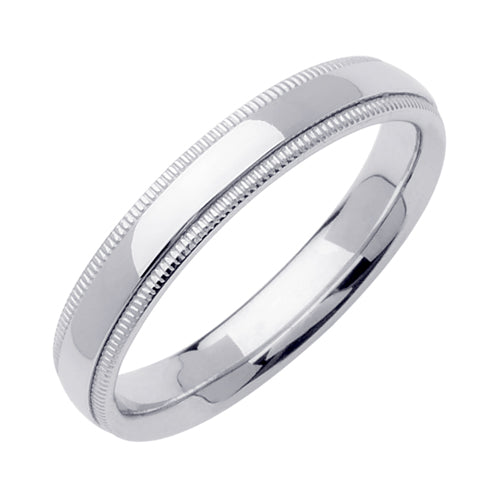 This simple, narrow 4mm men's wedding band has a comfort fit and very fine quality. The handmade 14k white gold band has a high polish finish complimented by beautiful modern milgrain detail on the edges. It's simply stunning!