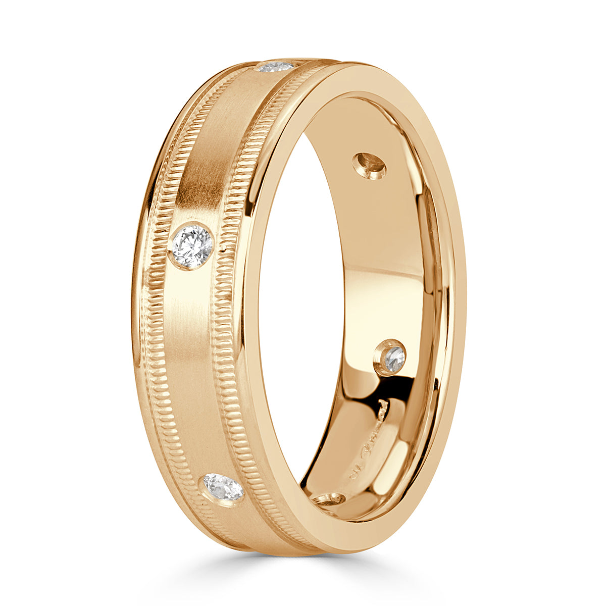 Set into the center of the men's wedding band are round brilliant cut diamonds totaling 0.20 carats, channel-set for a clean, secure, and seamless appearance. These diamonds are hand-selected for superior sparkle, clarity, and fire—adding just the right amount of luxury to a traditionally minimalist form. The symmetry and precision of the diamond channel setting not only offer lasting security but also highlight the craftsmanship that defines every Mark Broumand piece.