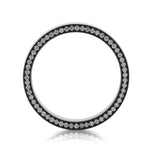 The design features pavé-set round white diamonds lining the side profiles of the band, adding a refined yet understated brilliance that contrasts beautifully with the dark metal finish. Each diamond is hand-selected for clarity and brilliance, creating a seamless border of sparkle that catches the eye without overpowering the sleek, monochromatic look.