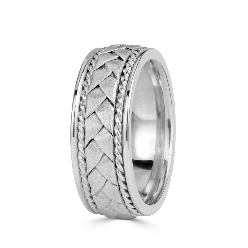 At 8.5mm wide, this men's band provides a bold yet comfortable fit, ideal for men who prefer a substantial ring without sacrificing comfort. The braided texture adds unique visual interest and a tactile feel, setting it apart from traditional smooth bands. Its intricate design speaks to both classic craftsmanship and modern style, making it a versatile choice for any groom or anniversary gift.