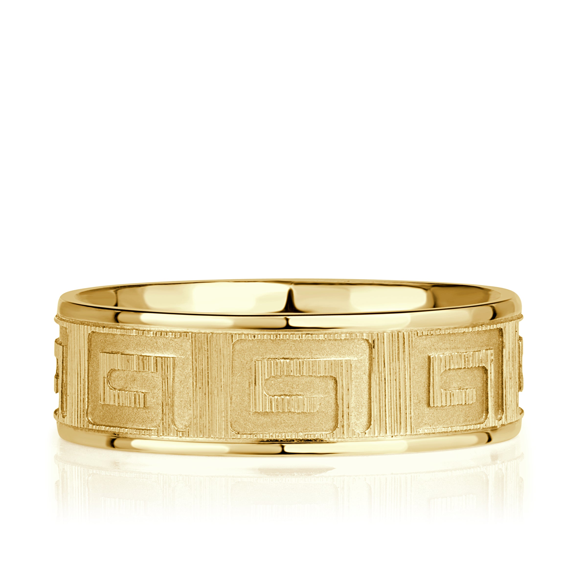 This version features a bold profile with enhanced presence on the hand. The textured and raised Greek key design is set against a sanded background, giving the pattern dimension and contrast, while the high-polish step edges provide a sleek, refined frame.