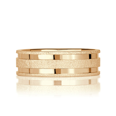 Designed to symbolize strength and commitment, this men's wedding band combines artistry with durability, making it ideal for men who appreciate craftsmanship and understated style. Whether you’re looking for a textured men's wedding band, a modern men’s ring with grooves, or a stone finish band that stands out from the crowd, this piece delivers on every front.