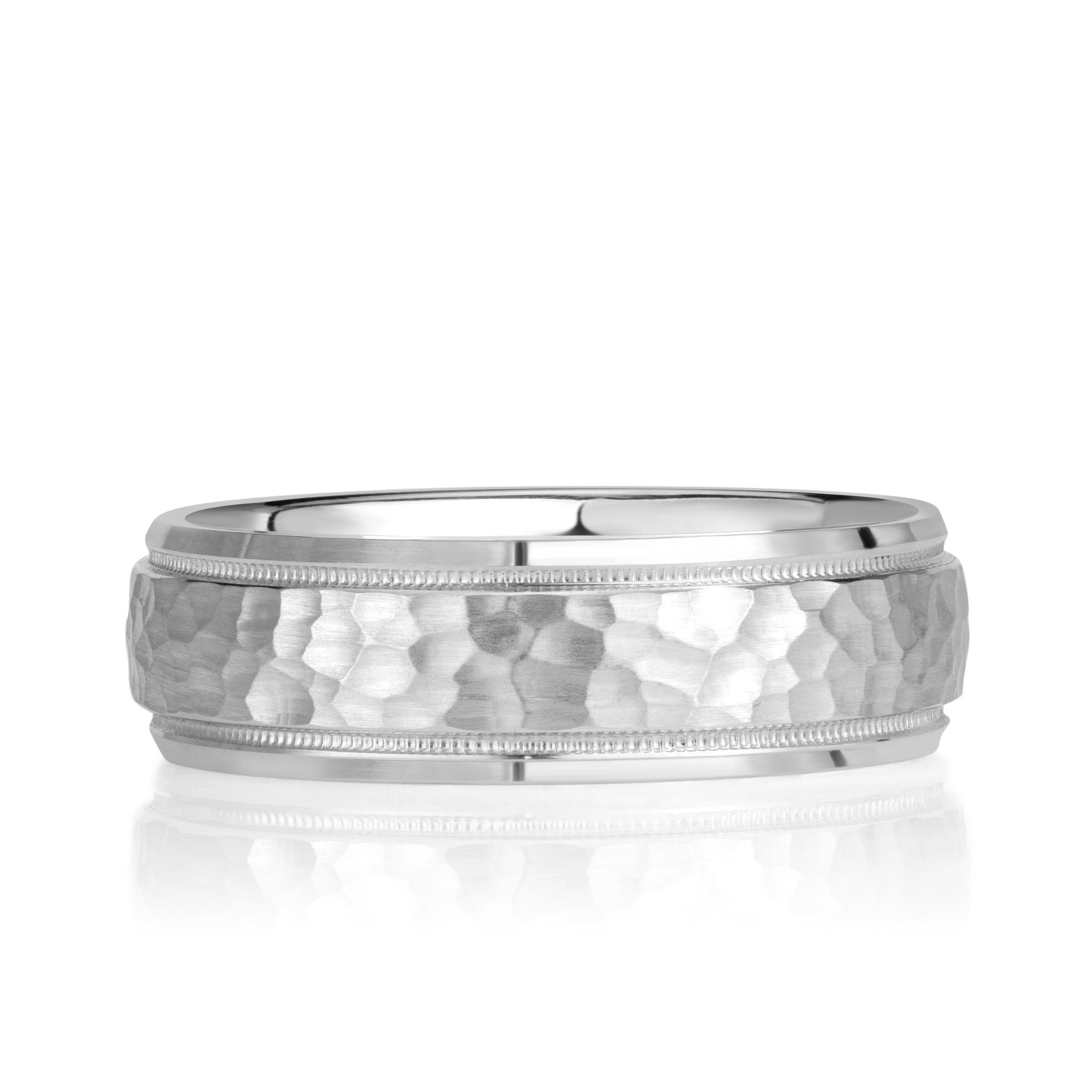 This men's wedding band is an excellent choice for men seeking a symbol of enduring commitment that balances tradition and contemporary style. The hammered texture symbolizes resilience and strength, while the milgrain detail highlights craftsmanship and attention to detail, distinguishing it from more conventional designs.