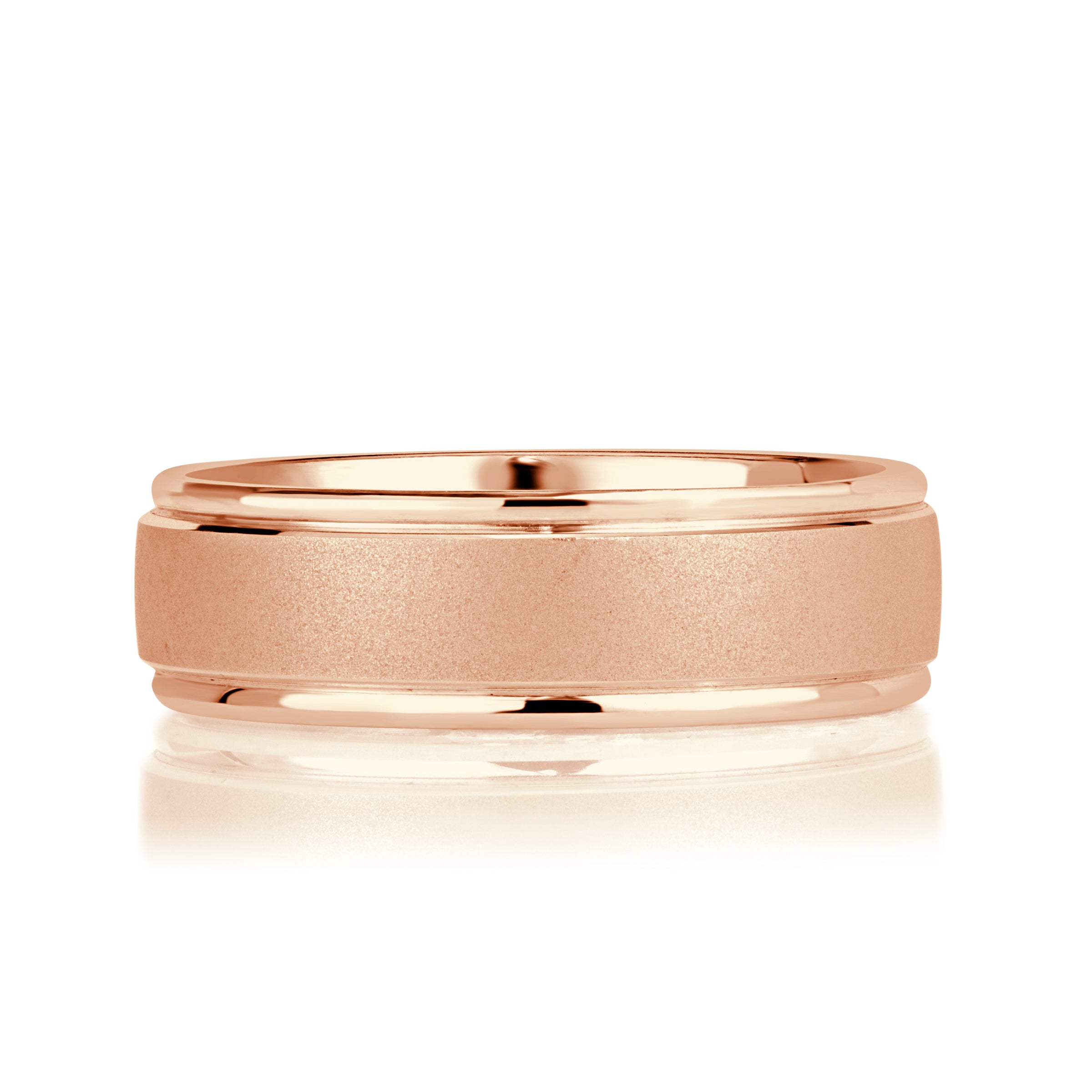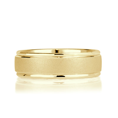 Discover the perfect blend of modern sophistication and timeless craftsmanship with the Sandblast Finish Rounded Edge Men's Wedding Band. This meticulously crafted ring features a matte sandblasted center, offering a distinctive texture that contrasts elegantly with high-polish edges. The 6.5mm width provides a bold yet refined presence, making it an ideal choice for grooms seeking a statement piece that combines durability with style.