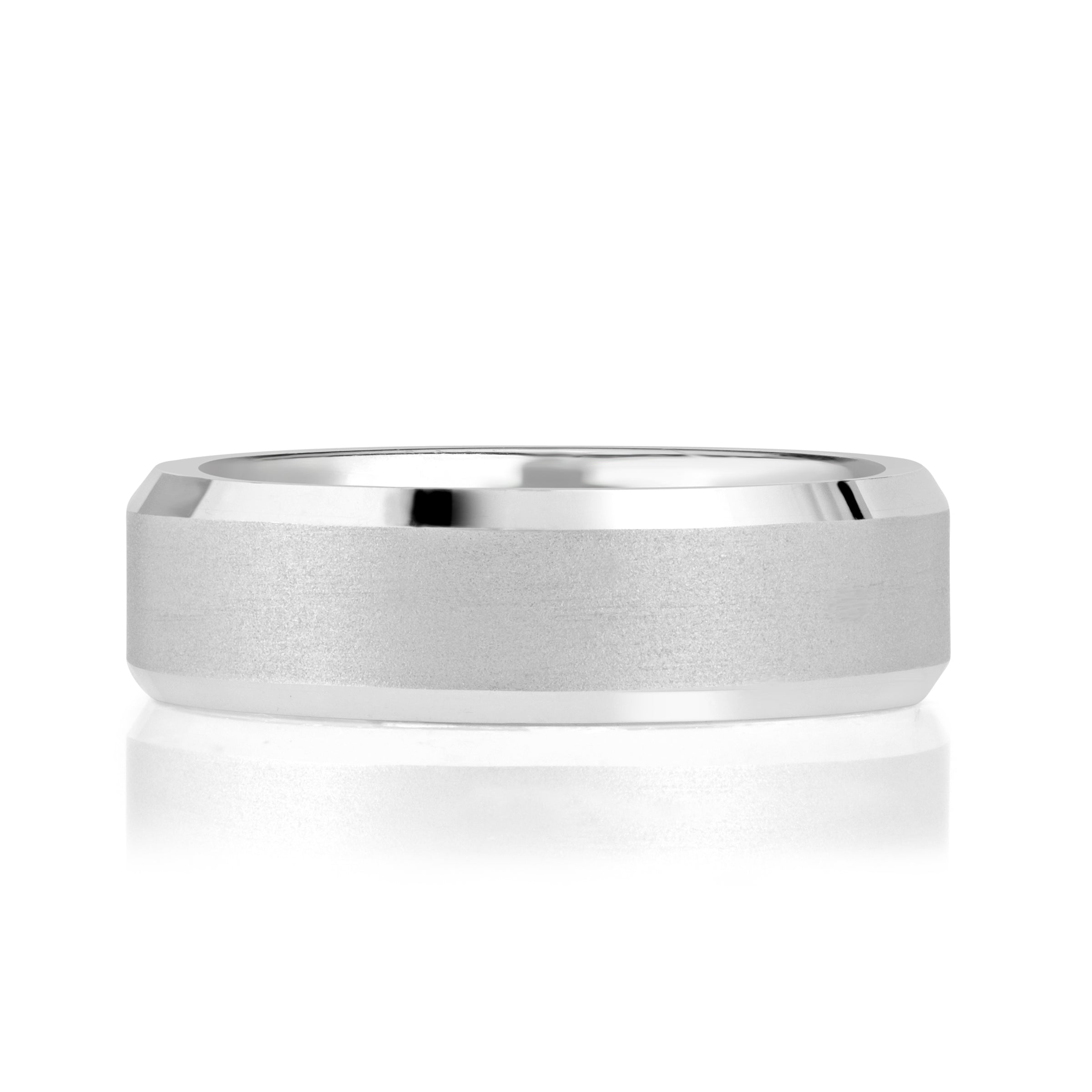 Discover rugged elegance with the Men’s Sandblasted Beveled Edge Wedding Band, a perfect blend of texture, comfort, and sophistication. Central to its design is a matte, sandblasted finish that offers a subtle, velvety texture—resistant to visible scratches and showing less everyday wear than polished rings. Polished beveled edges frame the center, creating a sharp contrast celebrated in high-end men’s jewelry .