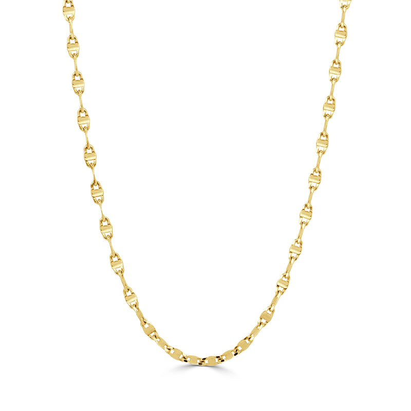 This dainty chain necklace features sleek, mirror-like links that reflect light with striking brilliance. At 2mm wide, it offers the perfect balance of delicacy and shine, making it a go-to layering necklace for any look. Designed for effortless stacking, it pairs beautifully with bold pendants or other fine chains. Lightweight yet eye-catching, its flat link construction drapes elegantly at every length. Whether worn solo for minimalist elegance or layered for a curated statement, this versatile piece elevates any jewelry collection with refined texture and modern edge.