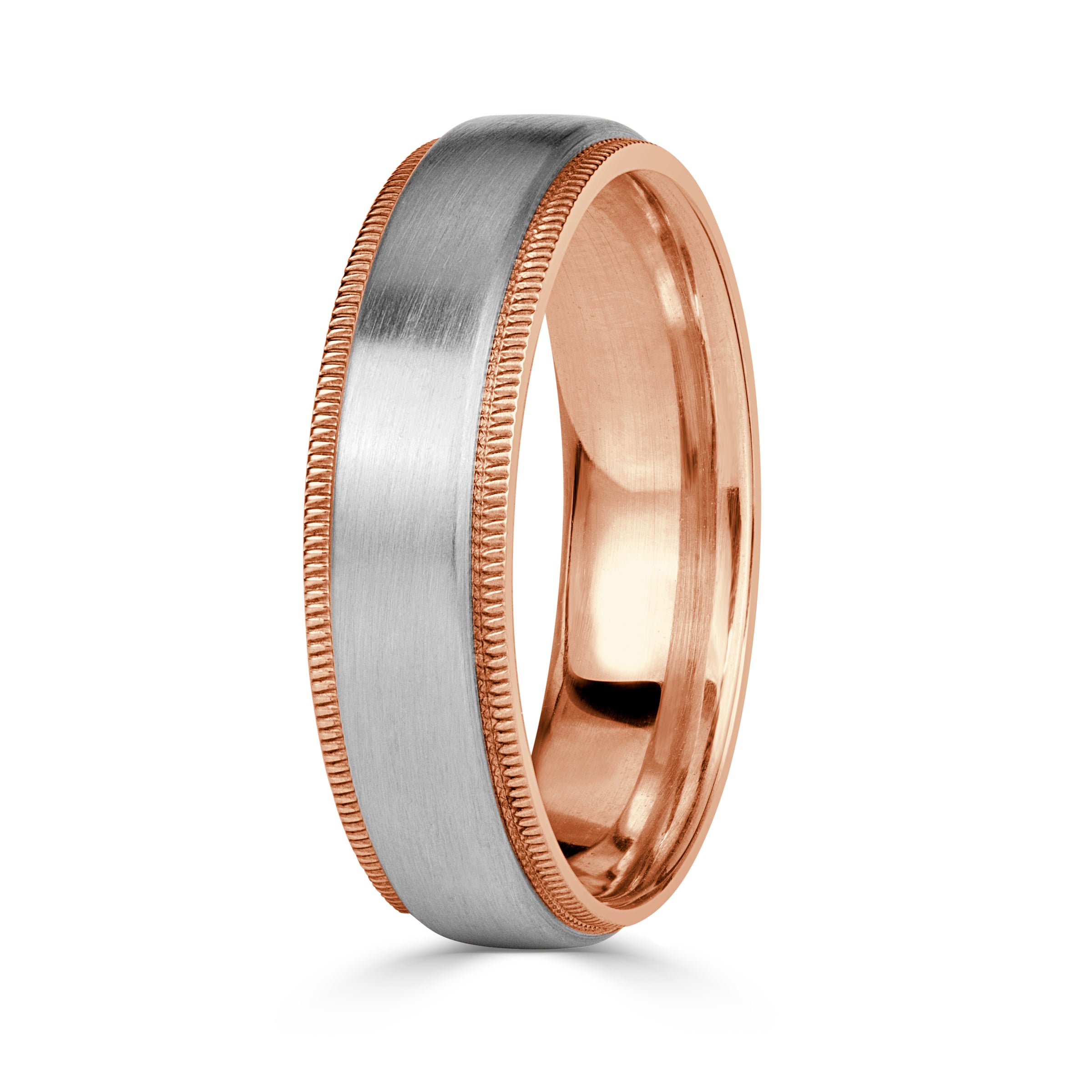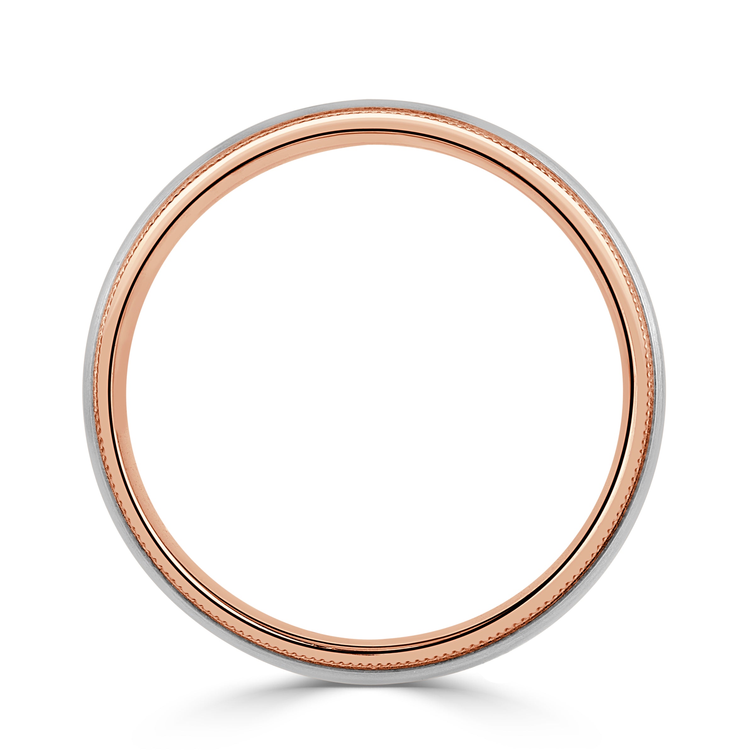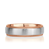 At an elegant width of 6mm, this men's band commands attention with subtlety.  Commitment to meticulous artistry shows in the satin finish texture, the precise milgrain work, and the crisp definition of the step edge. This ring is more than jewelry—it is a symbol of enduring love and unwavering devotion, polished to perfection.