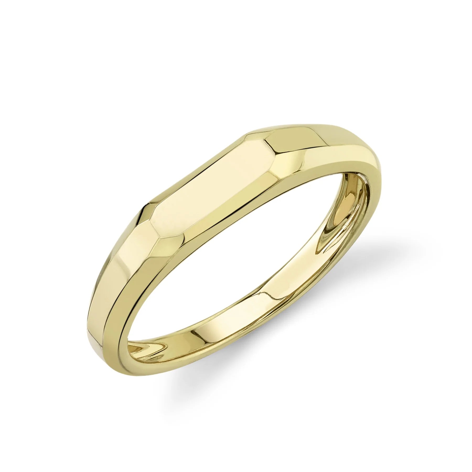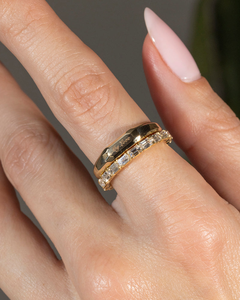 Our Slim Geometric Signet Ring in 14k gold is a sleek blend of modernity and classic charm, this ring features a refined geometric design. Crafted with precision, it adds a touch of sophistication to any ensemble, making it a versatile and timeless accessory for the discerning individual. Wear it sleek and clean as is or engrave it with something special. Engrave it to make it extra personal and special!